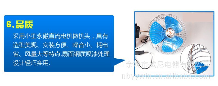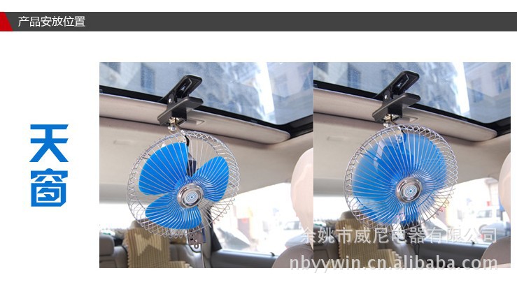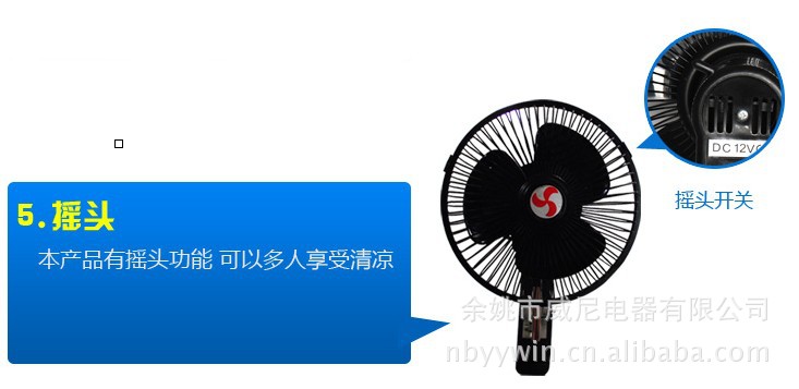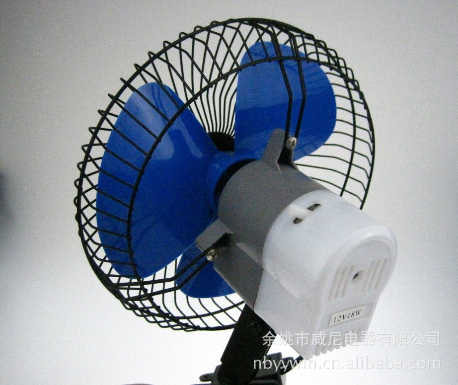 本款風扇由鍍鉻網罩(噴塑)、塑料扇葉、12/24V電機、鍍鎳支架、帶點煙器的電線等部件組成,有撥桿控制風扇搖頭。