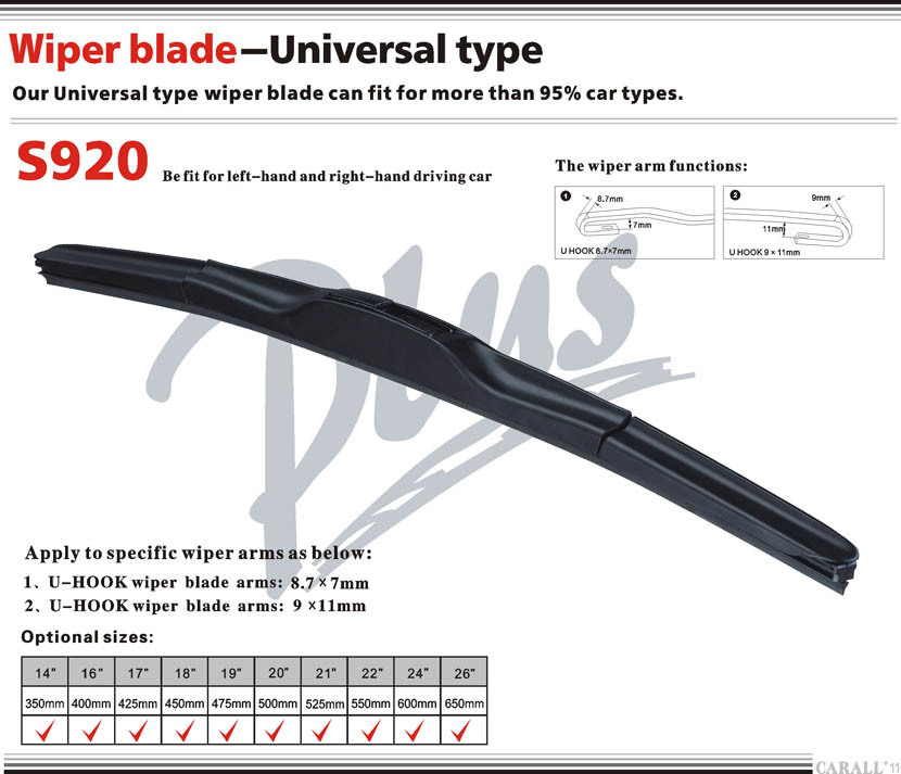 使用carall雨刷能提高駕駛安全,創造一種寧靜、清晰的駕駛環境。多功能的卡扣組合,使得雨刷片適用車型更廣,不僅適用於歐洲車,也適用於日本車。本產品選用的雨刷橡膠是自已工廠生產,經過日本進口測試儀器檢測,膠條上面的石墨有防老化,防止雨刷在刷洗過程中跳動,發出異響作用,雨刮片采用無骨架浮動鋼片結構,徹底消除運動發抖,壽命長,重量輕(從而延長雨刷電機,連杠的壽命)雨刷片非常柔韌,砂礫不容殘留,長壽命,比傳統雨刷附著力更強,刷得更幹凈.安裝方便,無需更換雨刮臂,快速,具有高溫,抗紫外線和耐低溫性能,適用與世界各地不同氣候,多種規格供您選擇,適合所有U型“掛鉤”接口的小轎車。