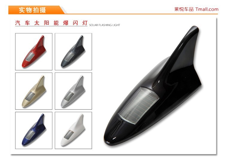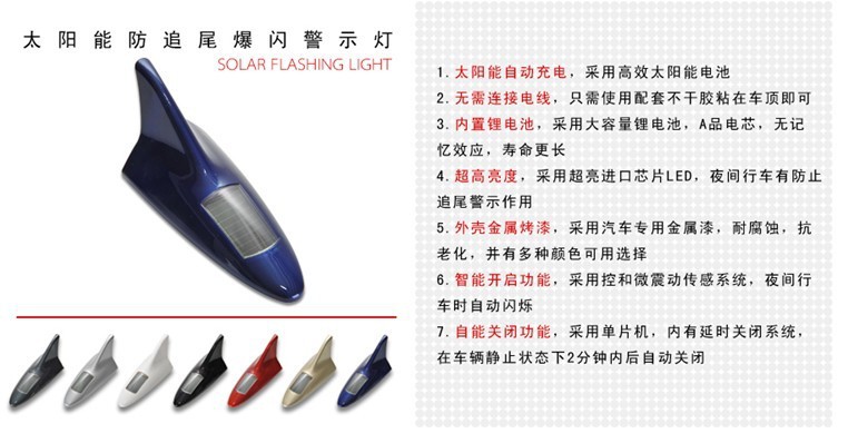 鯊魚鰭防追尾警示燈是一款新型的車載產品,該產品安裝於汽車頂部,不對原車做任何更改,通過吸收光能驅動大功率LED燈在光線較暗的環境中閃爍,以防止後車在視線不佳的環境中發生追尾等事故,該產品將來同高位剎車燈一樣,會成為汽車出廠時的標準配置。