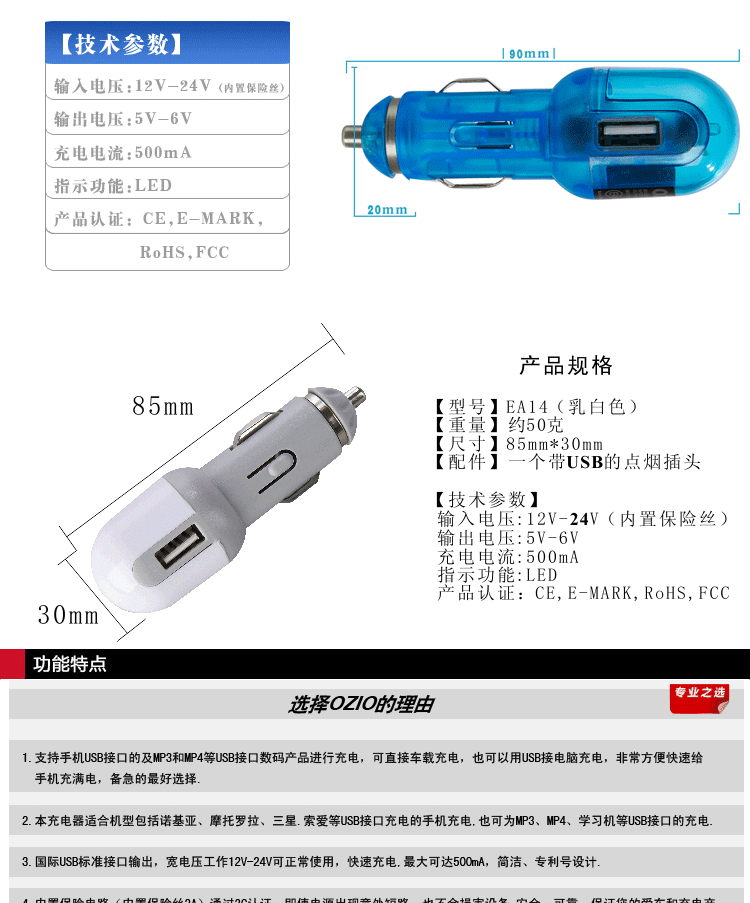 批發一路發提供客戶日本、大陸、香港、歐美奧舒爾EA14汽車充電器車載充電iphone、三星HTC一件代發czcdq-001批發、進口、代購的物流整合服務,針對機械、電子、半導體的零組件或機台設備等特殊性需客製化產品,我們也有各家工廠配合的専業工程師可回覆您的專業性問題。