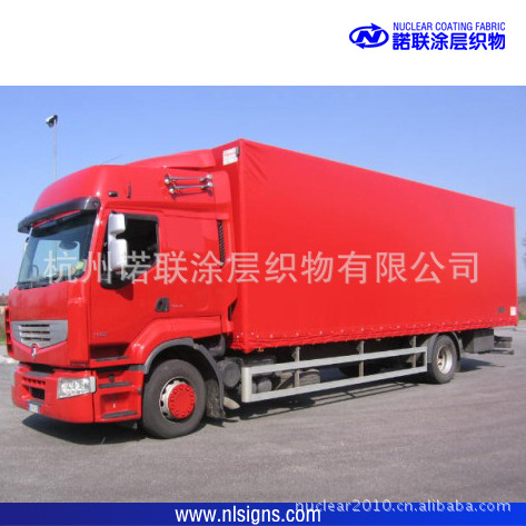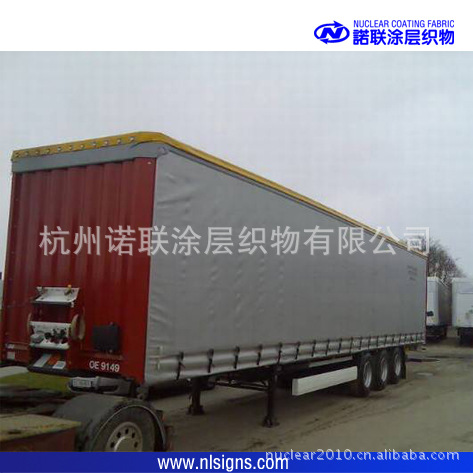 出口歐洲卡車篷佈,900克每平方米,1100丹尼爾聚酯滌綸基佈,單面表面丙烯酸表面處理,性能滿足卡車張力強度和撕裂強度。諾聯塗層織物有限公司可提供篷佈加工服務包括但不限於:熱風焊接,和高頻率焊接,加筋,穿繩,打扣,貼膜,噴漆。