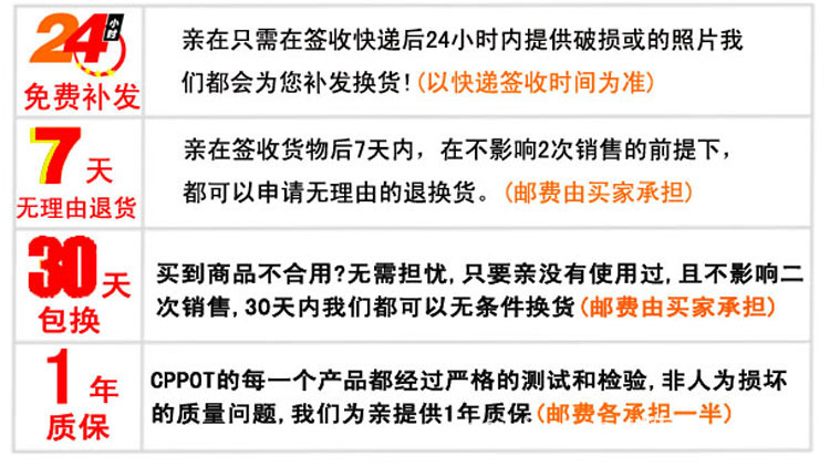● 關於發貨 本公司所有產品小批量為現貨發售,發貨時間一般為付款後2個工作日內,批量一般在7-15個工作日。但本公司每天配送大量商品,庫存隨時發生變化,如遇拍下無貨,請見諒!我們將在7個工作日內發貨。拍寶貝前請先和客服溝通。本店默認發貨快遞為客人指定,1000元以內不代發貨運! ● 關於收貨 請親們簽收時確認包裝是否完好,如果出現破損或者數量規格不符合,請及時聯系我們。親們也可以先收到貨物,有問題請於48小時內聯系我們,並提供照片為證,我們將免費補發所需物品。請親們放心,我們一定會對產品免費到底! ● 售後服務 保質一至三年,運費各出一半(客人出發過到公司的運費,我司出我司發貨時的運費)。 ● 關於圖片 本店所有的商品圖片均為實物拍攝,但是由於拍攝環境、光線和顯示器的不同,會出現一定的色差,請不能接受色差問題的親慎重選擇,所有商品以實物為準。此類問題不能作為中差評以及投拆依據,若因此類問題給予的中差評,我們會上訴淘寶,請大傢見諒。●本店每天配送大量商品,庫存會隨時發生變化,如遇拍下無貨,請見諒! |