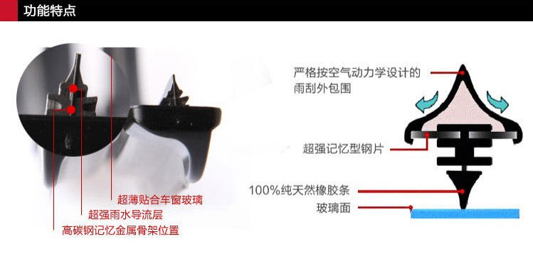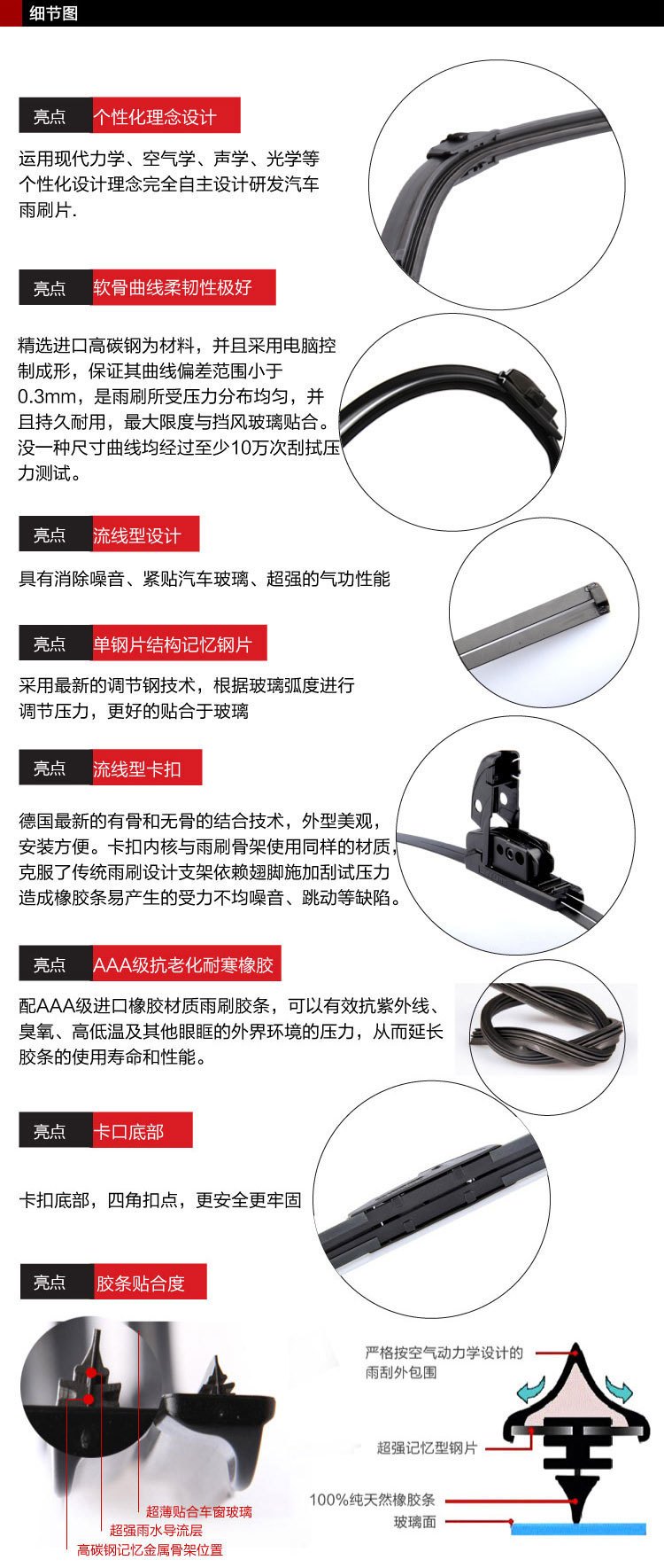 2. 追求與空氣動力學的完美結合,徹底消除汽車高速行駛時由於風力造成的運動抖動,使刮片對玻璃的磨損降到最低。