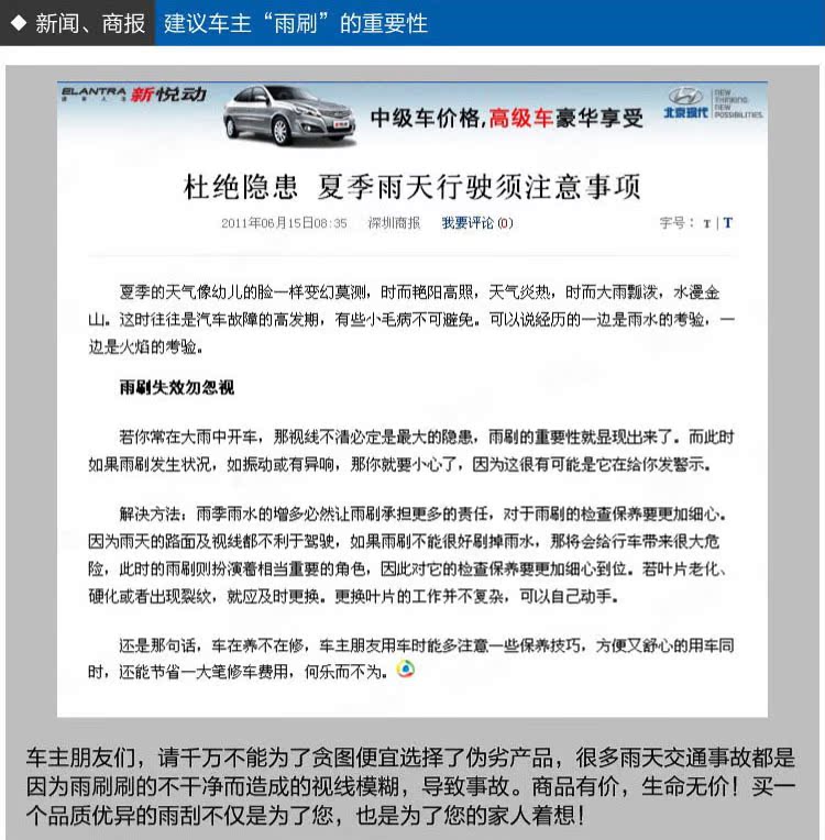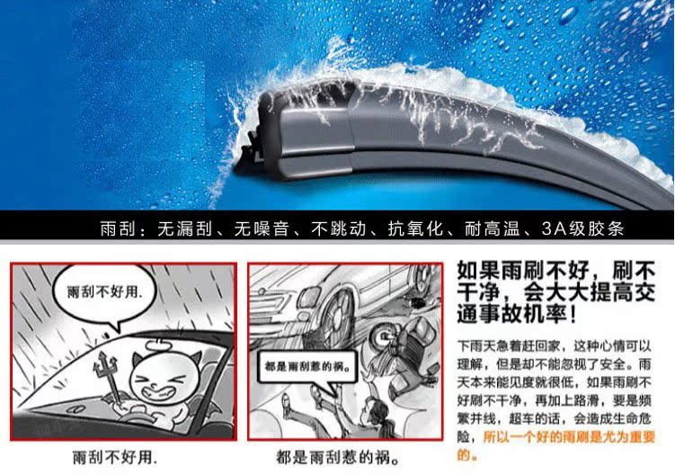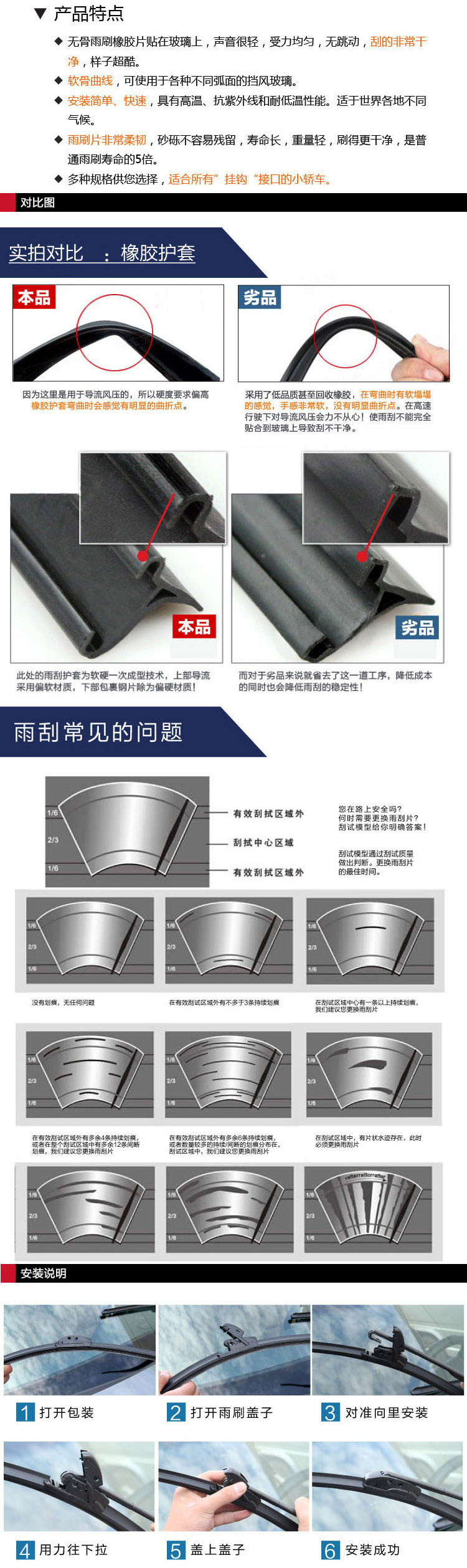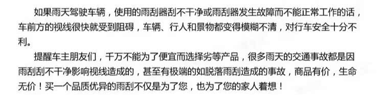 3、如果擋風玻璃上有油、蠟、污物等異物,先處理幹凈後使用。否則雨刮片不能正常工作,會縮短使用壽命。