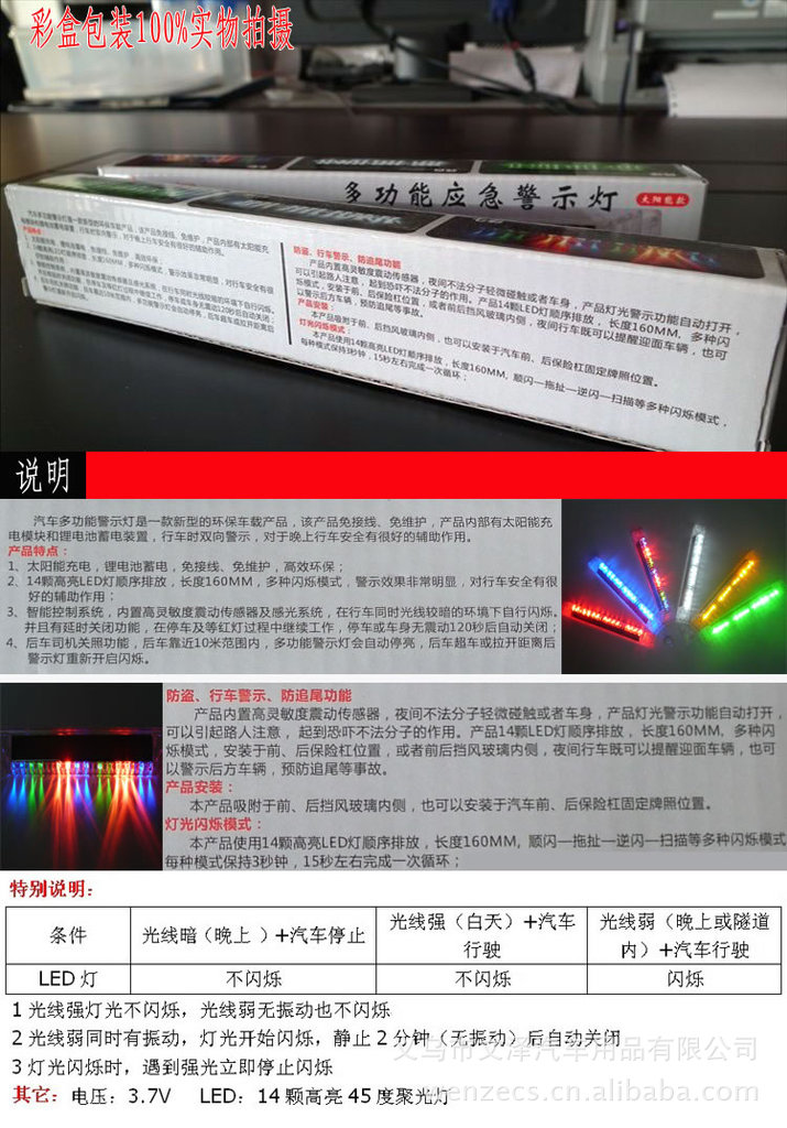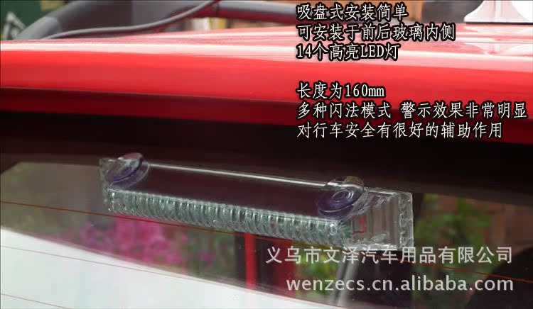 防盜、行車警示、防追尾功能,產品內置高靈敏度震動傳感器,夜間不法分子輕微碰觸車身,產品燈光警示功能自動打開,可以引起路人註意,起到恐嚇不法分子的作用。產品14顆LED燈順序排放,多種閃爍模式,安裝於前、後擋風玻璃內側,夜間行車即可提醒迎面車輛,可以以警示後方車輛,預防追尾等事故。