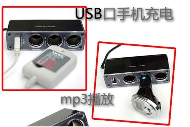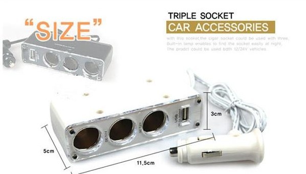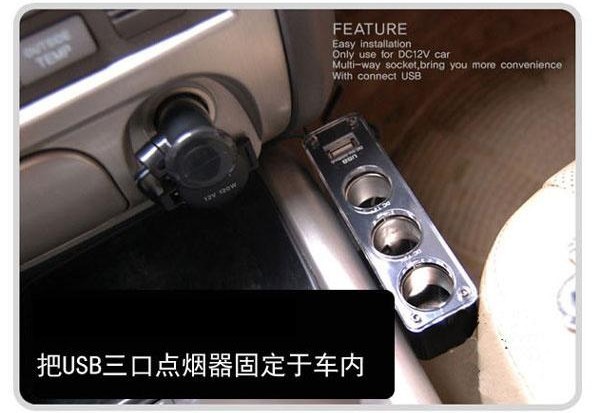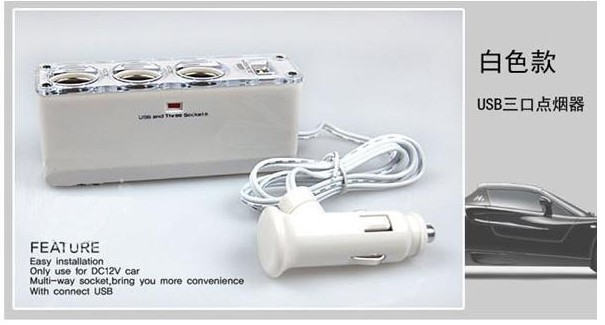 一個電源怎麼夠? 必須有一款一出多的點煙器插座才能滿足真正高品的車居生活,需要好多插電的東東:燈光、逆變電源、車載MP3、氧吧、溫度計等。 這個點煙器幫助你的愛車實現點煙器的擴展。 功能: 一分三,可插氧吧,MP3,氧吧,筆記本電腦等。 帶USB,5V輸出,可以充手機,MP3 MP4,相機等。 帶線,方便位置擺放。 材料為ABS進口質量的材料,表面光滑,質量好。 帶保險,負載短路的時候,保護汽車電路不受沖擊。 【商品名稱】一拖三+USB供電點煙器轉接器 【商品材質】 工程塑料 【商品顏色】 白色(如圖) 【商品說明】 外觀時尚,實用方便,靈巧精致帶延長線,長度約為90CM 【商品特點】 1.電源指示LED,可清楚告之電源是否接通; 2.伸縮式點煙插頭,適用性更強; 3.一體化設計,使用更方便 包裝:英文出口吸塑包裝. 產品顏色:白 黑色可選 產品規格:11*5*3厘米 外殼材料:ABS阻燃塑料,做工用料都非常好!推薦^_^ 電線長度:90cm國標電線 額定電流:5A/250V 輸出電壓:轎車輸出12V,,貨車輸出24V,貨車親們註意!!! USB口為5V 保險裝置:內配玻璃保險管,能防止電器過載. 五金件:鍍鎳 應用:提供多路輸出電源,USB可以為手機、小靈通、ipod等充電 1、 此款產品為OEM出口產品,質量可靠,長期供貨,做工精致細膩