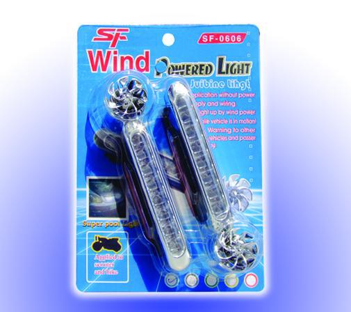 汽車外使用(也可用於摩托車,甚至是單車),當車子行駛時,氣流帶動風葉產生電能使產品發光(此款會發出藍光,超級的炫哦),車行駛時,利用風力,帶動產品的風輪,轉速越快,燈就越亮
