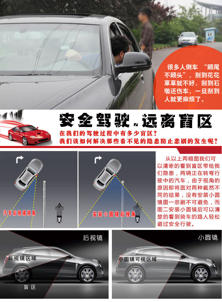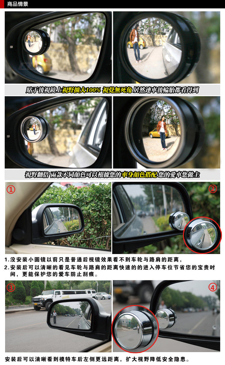 這款立體廣角小圓鏡,可直接貼在車外後視鏡上,360度可調角度的設計,為您增添又一雙可調節角度的“眼睛”,保證駕駛安全,增大駕駛員觀察視角,