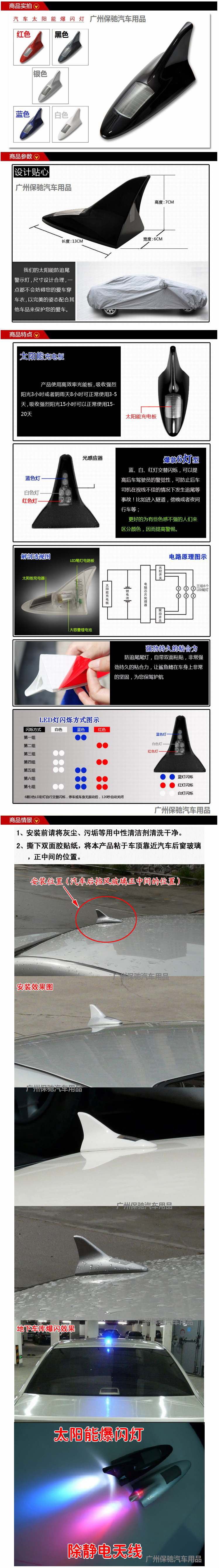 該產品安裝於汽車頂部,不對原車做任何更改,通過吸收光能驅動大功率LED燈在光線較暗的環境中閃爍,以防止後車在視線不佳的環境中發生追尾等事故。