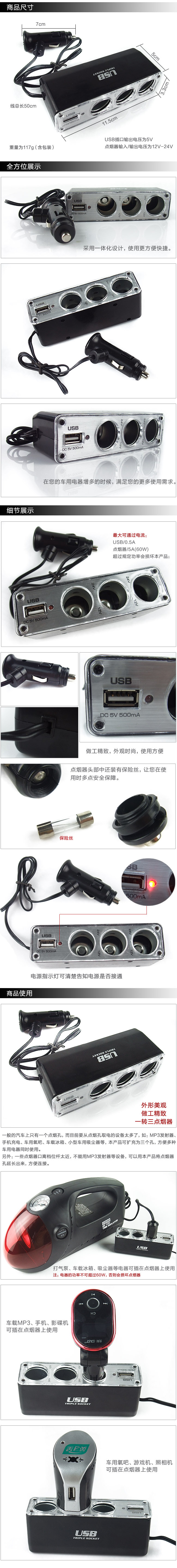 WF0096一拖三汽車點煙器 帶usb 點煙器插座一分三 車載電源插頭