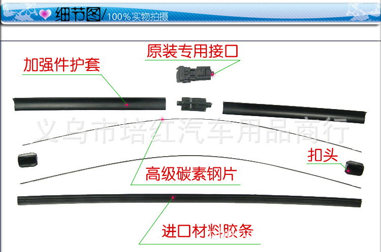產品膠條采用世界先前切割技術,純天然橡膠精制而成表面可根據客戶需要采用不同的處理方式,分別有“s-氟潤滑劑、s-石墨化處理、N-鹵化處理”,鋼條及有骨支架采用優質鋼材高碳鋼經熱處理、接頭有金屬和聚合物兩種。整個設計運用現代力學、空氣學、聲學、光學等個性化設計理念自主設計研發汽車雨刷片,產品質量上乘,外形美觀大方。該產品刮凈度好、清晰度高、去污性強、耐磨性好、使用壽命長。