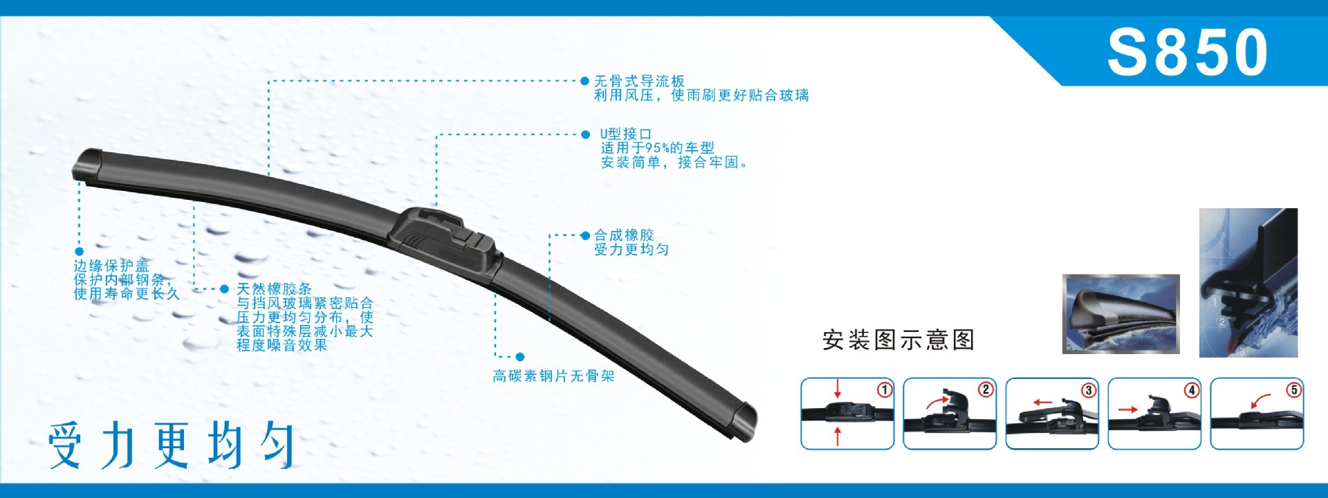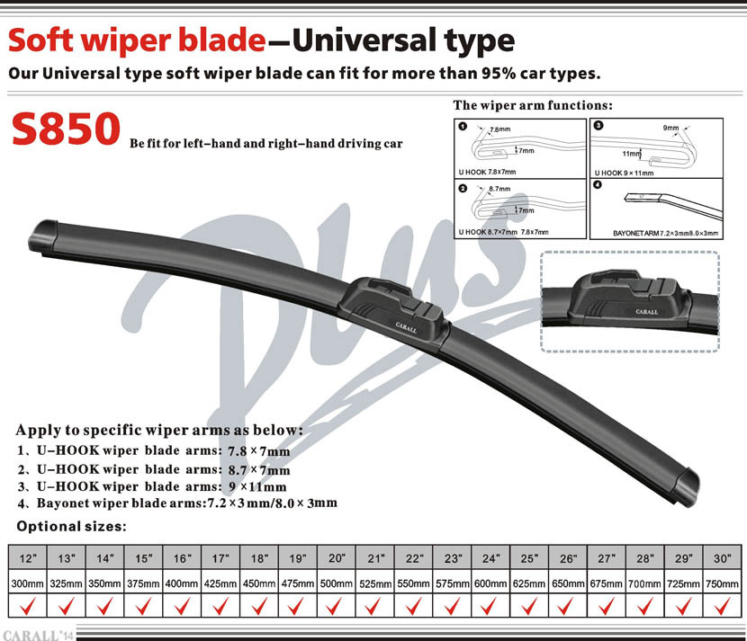 Carall無骨雨刷保證您獲得清晰的視野。通過創造性的橡膠合成,改進的膠條技術和經使用證實的長效穩定表現,carall無骨雨刷代表著最佳視野和安全性。Carall無骨雨刷確保完美的刮拭效果,防止被風抬起和跳動。刮拭不留任何痕跡。為您的安全,它在夜間有防眩目作用。此外,它的刮拭安靜,具有抗老化能力。Carall無骨雨刷幾乎適合所有中國、日本、美國和歐洲生產的車輛.
