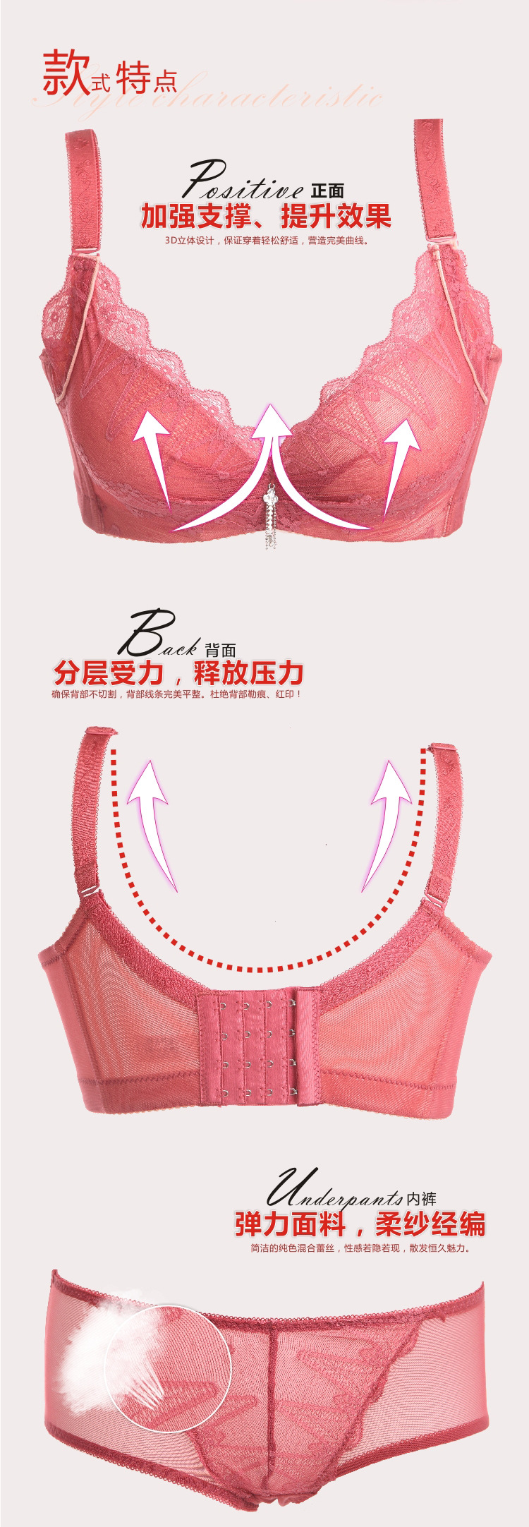 小胸必備的上薄下厚款式,有2公分厚哦,蕾絲面料柔軟親膚,後面是四排扣加寬設計,質量屬於上乘的哦,最關鍵的,是可以很好的把副乳收進去,聚攏的同時使胸部更加挺拔