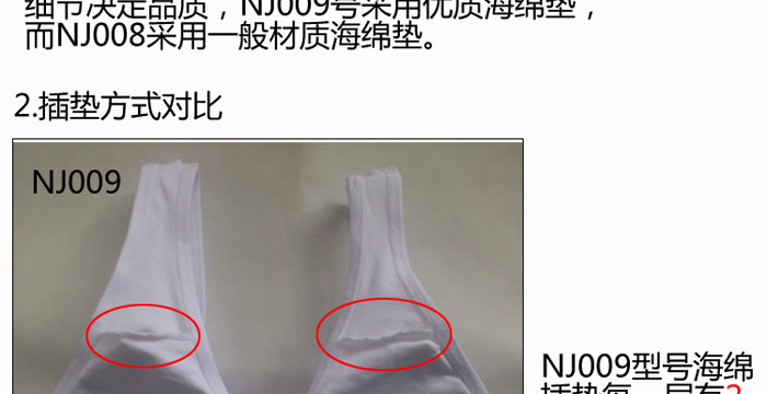 敬請親們註意:雙層帶海綿墊內衣,本店共有兩款,如親們需要普通版(產品型號:NJ009),可以點此鏈接(http://detail.china.alibaba.com/offer/1234181701.html)進入購買,以下是NJ009(升級版)和NJ800(普通版)的對比圖,均為實拍。