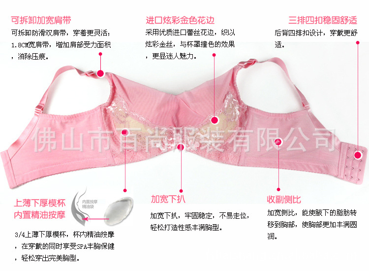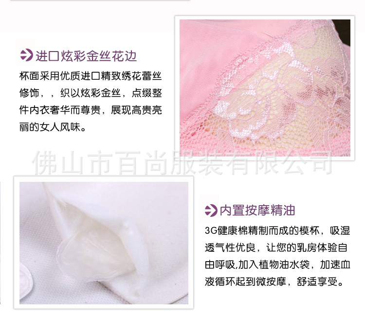 【款號】:1078 【名稱】:浪漫蕾絲 高端精油水袋調整型胸罩 【顏色】:粉紅、膚色、黑色 【罩杯】:3/4杯型,中模杯 【尺碼】:70-85A B杯 70-80C杯 【插口】:不可放插片 【裡罩】:全棉 【排扣】:三排四扣 【肩帶】:寬約18mm,可拆卸 【下比】:加寬下比,牢固穩定,不易走位。 【包裝】:可OEM貼牌,內標成份通用標。無吊牌。專櫃檔次環保包裝(如底部圖示) 【適穿體形】:1、中小胸MM 2、胸下垂 3、胸外擴 4、有副乳 5、腋下、背部多脂肪 |