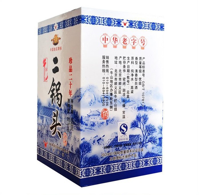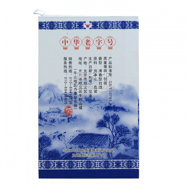 【介紹】:二鍋頭之宗,二鍋頭作為京酒的代表,已有八百多年的歷史。京師釀酒師蒸酒時,去第一鍋“酒頭”,棄第三鍋“酒尾”,“掐頭去尾取中段”,唯取第二鍋之貴釀。牛欄山二鍋頭,宗氣一脈相傳,於2002年9月4日榮獲“國傢二鍋頭原產地認證”。