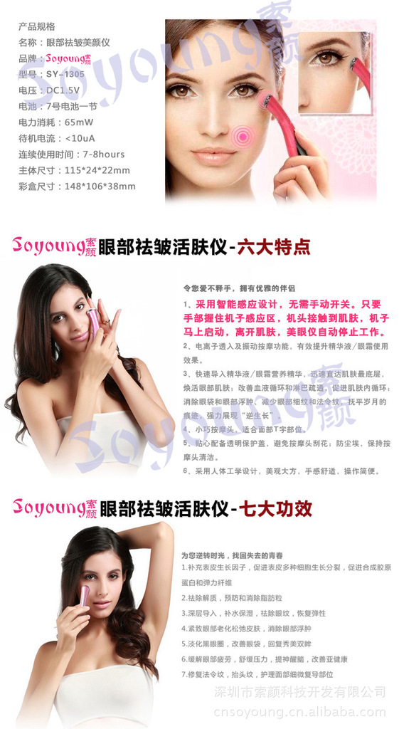 深圳市索顏科技開發有限公司是一傢專業致立於集設計開發、生產、銷售個人護理用品,美容化妝器具為一體的生產型企業。公司秉承高品質、高標準的質量方針,誠信、周到的服務,為消費者提供時尚、優質、實用、物美價廉的美容器具,使您的傢庭或辦公室都能成為真正DIY美容院。