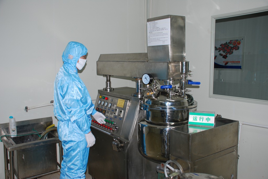 生產車間配置PLC真空乳化攪拌裝置、液面規范液體充填機、真空式液面規范液體充填機、微電腦定量充填機、容器旋轉式膏類充填機、回轉式洗瓶機、氣壓升降攪拌機、電熱式烘瓶機、膠體磨、研磨機、噴碼機、三維包裝覆膜機等各類生產設備