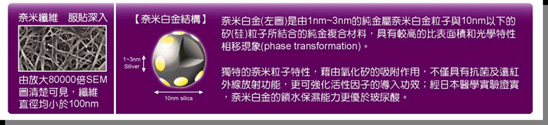 結合醫學美容權威及頂極生物科技所研發出新一代生物纖維面膜,其特殊生物質地細致柔嫩親膚性高,可淡化皺紋強效保濕,使肌膚緊致而彈性,醫療及生物纖維直徑為2-100奈米,約為頭發的1/1000細,屬於新世紀奈米及生物科技產品