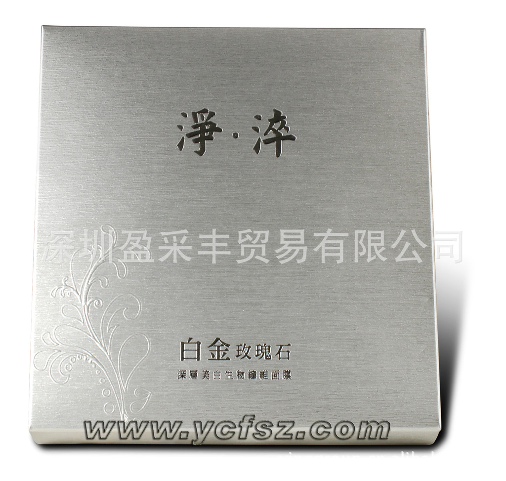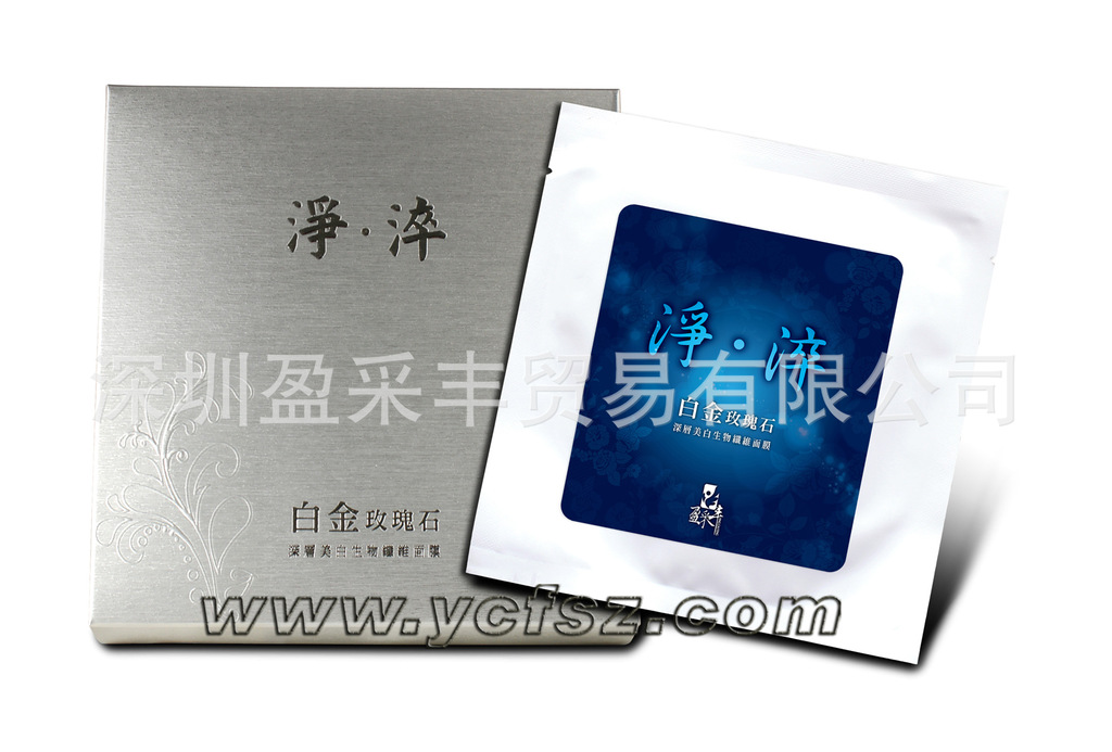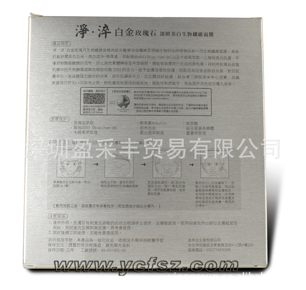 凈.淬 白金玫瑰石生物纖維面膜為結合醫學美容權威及頂極生物科技所研發出新一代生物纖維面膜,具有抗氧舒壓美白功效,美白成分-熊果素,搭配維他命B3(Niacinamide)以及卡姆果萃取一三階段美白肌膚,不僅抑制酪氨酸莓的活性,防止黑色素體轉移至角質細胞,還能有效還原已生成的黑色素。再利用玫瑰石促進肌膚中的天然酵素超氧化物歧化脢(SOD)的活力,給予皮膚深度的保護,搭配奈米白金去除自由基,對抗肌膚老化。玻尿酸強力鎖水的效果,提升肌膚保水力,3D立體網狀結構,經臺灣工研院奈米中心證實,其纖維直徑介於30~100奈米之間,對肌膚具有絕佳的親和性,服貼性和透氣性,有效提升活性成分導入效率。