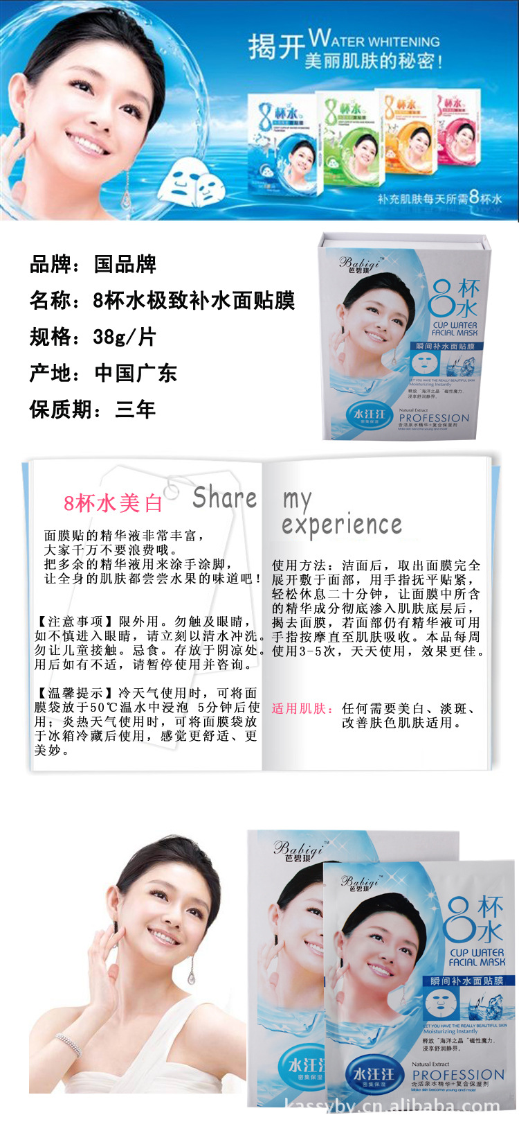 使用方法:用溫水清潔面部皮膚,將面貼膜緊貼臉部,可用手輕輕拍打面部使貼敷更緊;貼於面部約15-20分鐘;揭去面貼膜即可。建議每周使用3-4次。