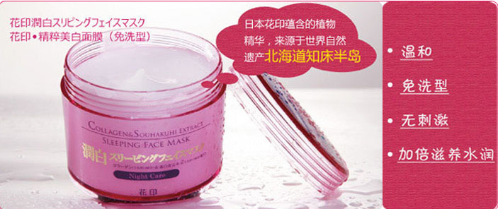 這是一款集美白、保濕、修護三重功效的美白睡眠面膜,能讓肌膚在夜間吸足營養,充分滋潤;有效改善肌膚暗沉狀態,提亮膚色。含可溶膠原蛋白,日本原始地區提取的桑白皮精華等多種美白保濕精華成分,深層補充肌膚營養的同時形成一層透氣的薄膜,持久鎖住肌膚水分。經常使用,肌膚自然煥發白皙透亮光彩!配方溫和,不含任何香精香料,敏感肌膚同樣適用。