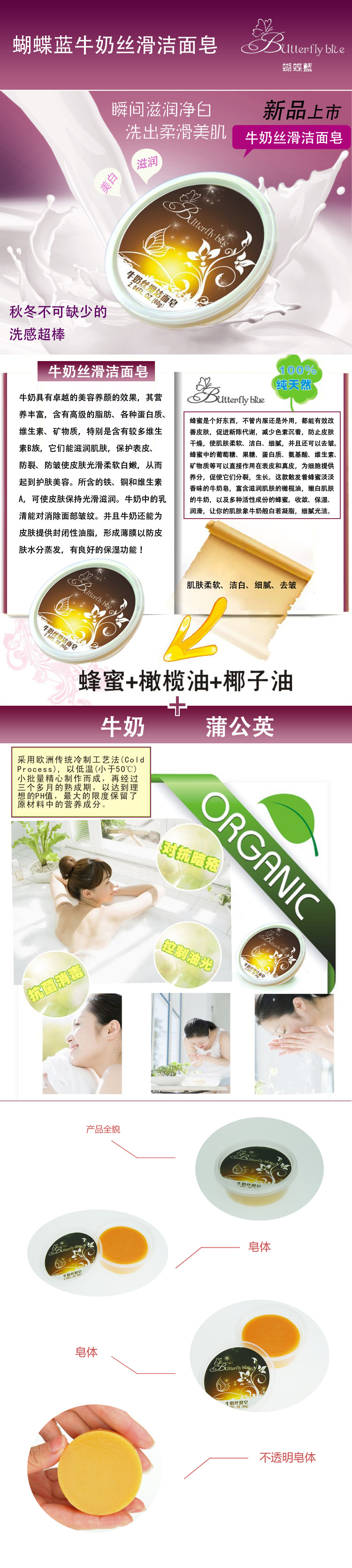 ◇選用杏仁油、太陽花油、橄欖油、椰子油、可可脂等天然優質植物油脂為原料,不含防腐劑、人工色素等非天然成分,並特別添加蜂蜜、牛奶、植物精油等護膚成分,