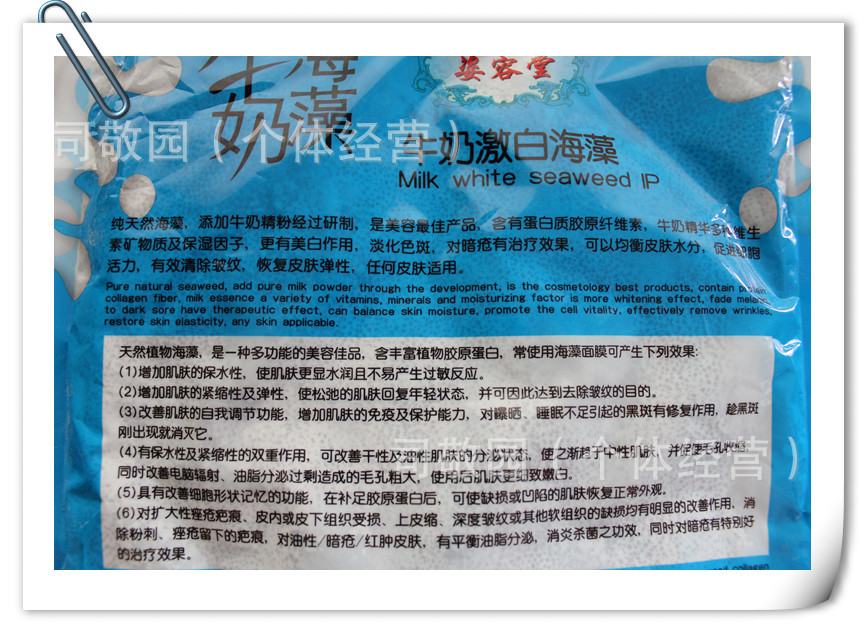 本品由天然植物海藻與牛奶配制而成,是一種多功能有效美容面膜,經過中美日高科技醫學研究中心發明,她含有蛋白素,維他命E,纖維素,能對臉部皮膚起到祛皺,祛斑,美白,消炎,祛痘,消除眼部,眼袋皺紋,增加營養水分,使肌膚更有彈性和青春活力。 特別添加玫瑰精華,深層滋潤皮膚,保濕效果長達12小時, 確保營養成分完全吸收, 高濃度維他命C, 集中擊散集聚色斑,強化美白效果,重現自然光彩。