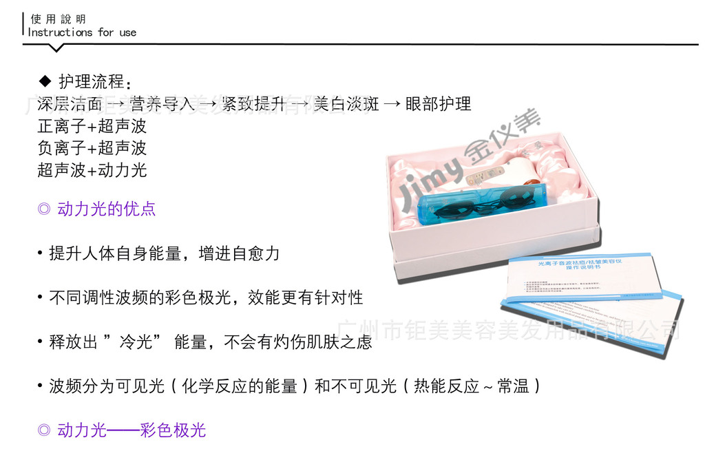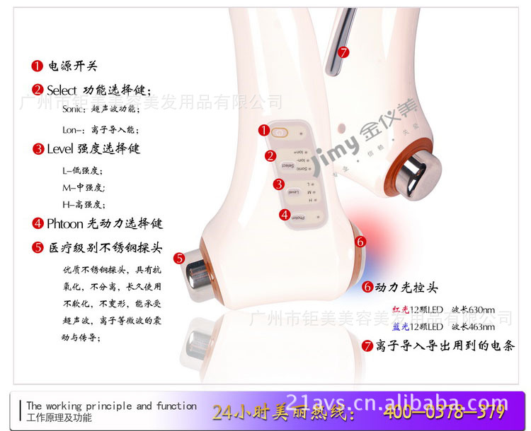 光 離 子 音 波 除 皺 美 容 儀 根 據 人 體 工 程 學 原 理 . 對 人 體 進 行 溫 灸 療 法 , 打 通 面 部 經 絡 阻 礙 處 . 深 層 次 的 改 變 組 織 , 活 絡 細 胞 而 發 生 震 動 . 使 之 氣 血 舒 暢 . 加 速 物 質 源 的 交 換 , 以 便 更 好 地 打 開 毛 孔 ,給 細 胞 輸 送 營 養 物 質 , 迅 速 補 充 細 胞 能量 . 用 以 實 現 美 化 皮 膚 , 結 實 皮 下 組 織 ,擴 張 血 管 , 恢 復 肌 肉 的 擴 張 力 與 彈 性 等作 用 .