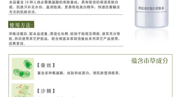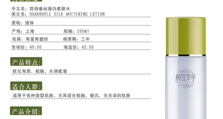 | 適用膚質:通用 | 適用人群:通用 | 產品系列:相宜本草四倍蠶絲凝白柔膚水 |