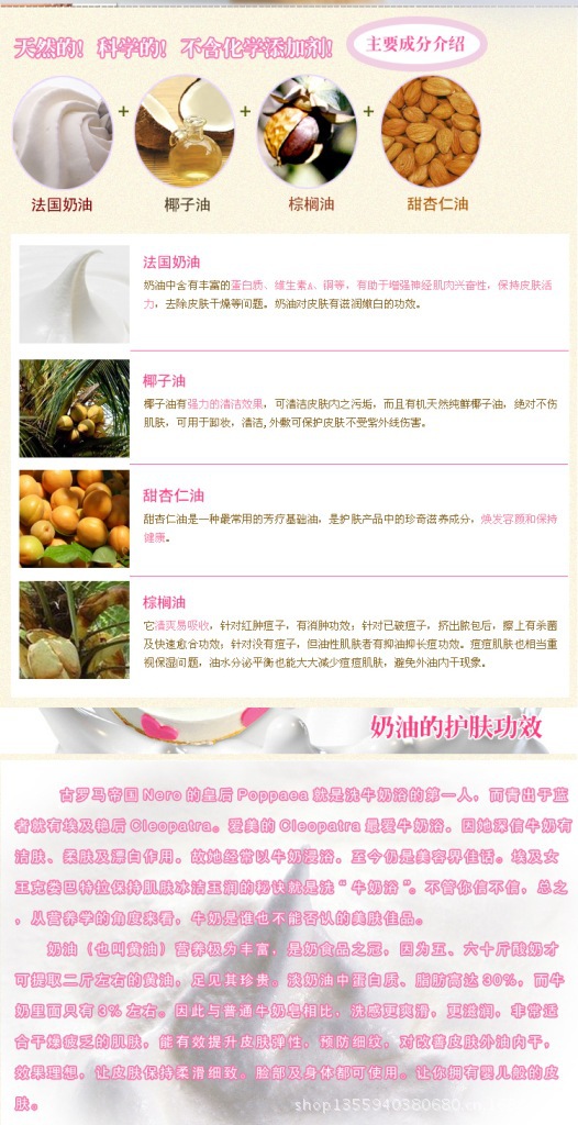 成分: 牛奶 椰子油 甜杏仁油 棕櫚油 其他成分