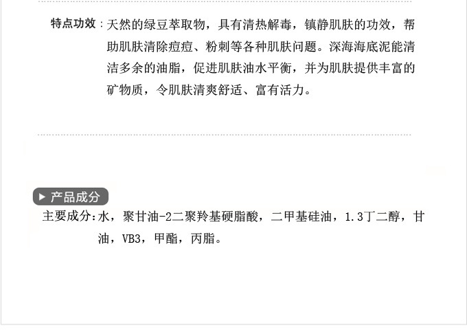 水,聚甘油-2二聚羚基硬脂酸,二甲基矽油,1.3丁二醇,甘油,VB3,甲酯,丙脂。天然的綠豆萃取物,具有清熱解毒,鎮靜肌膚的功效,幫助肌膚清除痘痘、粉刺等各種肌膚問題。深海海底泥能清潔多餘的油脂,促進肌膚油水平衡,並為肌膚提供豐富的礦物質,令肌膚清爽舒適、富有活力。