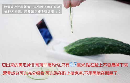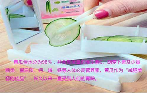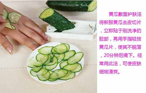 將黃瓜洗凈切薄片直接貼於臉部,具有潤膚、增白、除皺的作用。