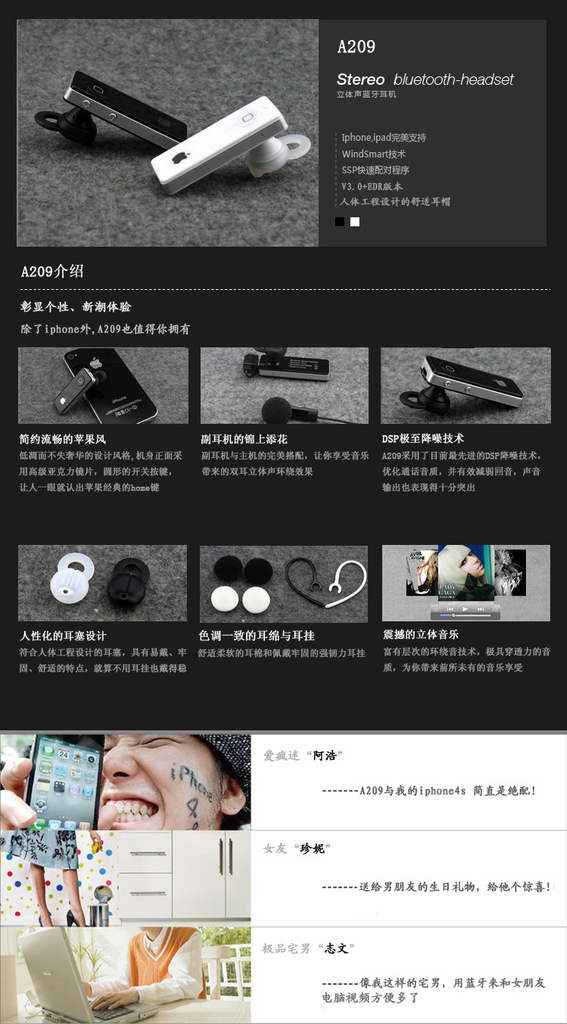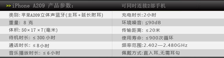這款藍牙耳機外殼采用高檔黑色PC材料搭配銀白ABS鑲邊而成。其外形就是一部迷你版的iphone,這樣便更體現出它的科技時尚性。它一出世,就吸引瞭很多蘋果迷的眼光。。兼容Iphone4(ios)、Symbian(塞班)、Android(安卓)等主流手機系統。如支持蘋果iphone、ipad、itouch系列產品, 三星、HTC 、諾基亞、索愛、摩托羅拉等所有手機也不在話下,隻要有藍牙立體聲功能,統統支持聽音樂通話~~~~