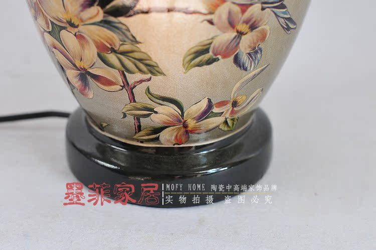 本產品為傢居裝飾用臺燈,藝術造型的燈體,田園彩繪的花紋,既是傢居必用品,又是現代都市田園氣息感極強的裝飾品。帶給您方便實用的同時,還帶給您清怡舒適的享受。