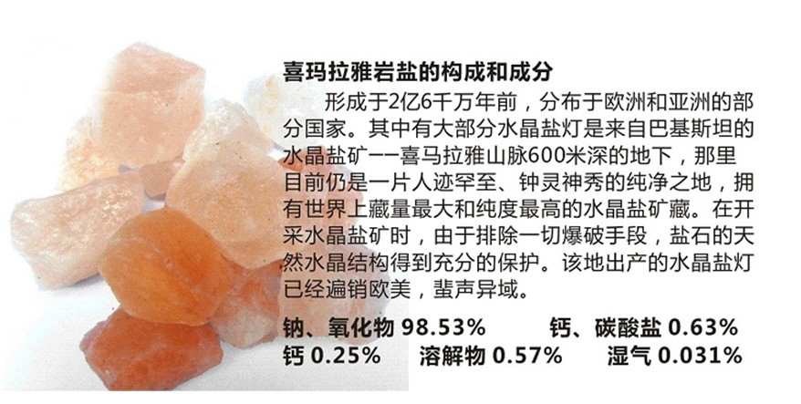 水晶鹽學名巖鹽,是鈉鹽的一種,形成於在二疊紀末期,也就是比最早的恐龍還要早四千萬年,即約2億8千萬年前劇烈的地殼變動把遠古的海洋變成舉世聞名的『喜馬拉雅山』,而海水中的鹽份則被深藏在約600米的地下,經過幾億年的擠壓與高溫將地底的礦物與海鹽結合形成巖鹽礦。水景鹽礦石因礦物質的純度和成分不同而產生不同的顏色如紅、白和黑色,如水晶一般,其中以純凈的橙粉色最為名貴。巖鹽礦藏的分佈很廣,但是純度較高、能作為水晶鹽的卻極少,隻有阿爾卑斯山脈及喜馬拉雅山脈才存在純凈度達到98%以上的純凈礦石可以用來制作水晶鹽燈。