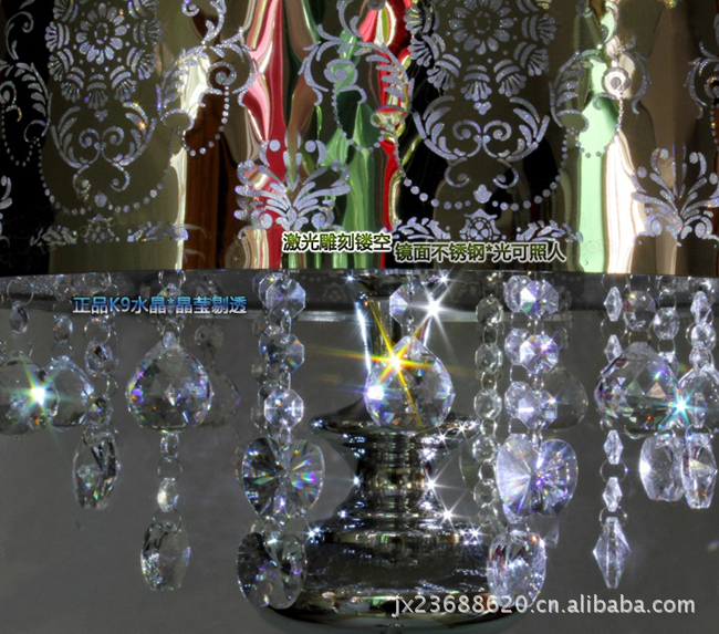 開燈效果,不銹鋼燈罩,K9一級水晶吊墜,高檔典雅,我們另外還有幾款吊水滴落地燈