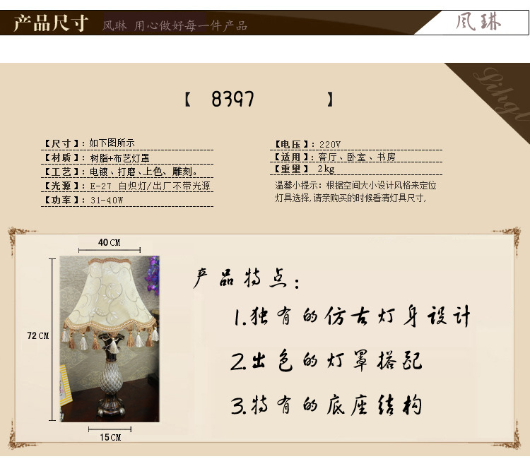 義烏市風琳燈具廠是歐式臺燈、落地燈、佈藝臺燈、樹脂臺燈、陶瓷臺燈等產品專業生產加工的公司,擁有完整、科學的質量管理體系。義烏市風琳燈具廠的誠信、實力和產品質量獲得業界的認可。歡迎各界朋友蒞臨參觀、指導和業務洽談。l聯系人:魏平 電話:15957974552 業務QQ:2827371705 郵箱:[email protected]