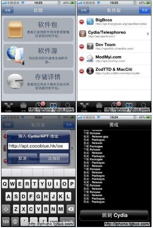 我們前面有說到,蘋果設備在使用這款產品的首先條件就是要越獄安裝Cydia。進入Cydia後點擊管理→軟件源→編輯→添加,再輸入http://apt.cocoblue.hk/ios,點擊“添加源”進行下載。
